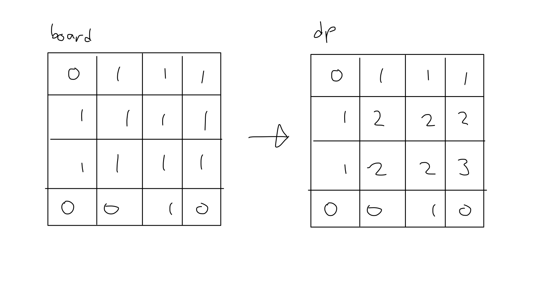 DP를 보자마자 떠올렸고 1일 때 자신의 좌상대각선, 좌, 상으로 정사각형을 만들 수 있으면 될 것 같았다.