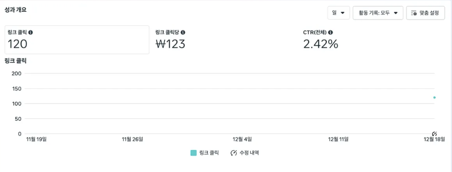 1일차와 2일차에서 클릭율이 4배가 오른 것을 볼 수 있다. 똑같은 광고 소재를 썼었다.