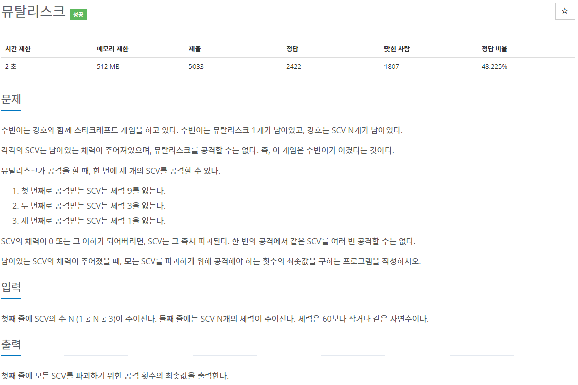 scv는 1 ~ 3마리이므로 3차원 배열을 선언해주고 1마리나 2마리일 경우는 0으로 채워주면 된다.