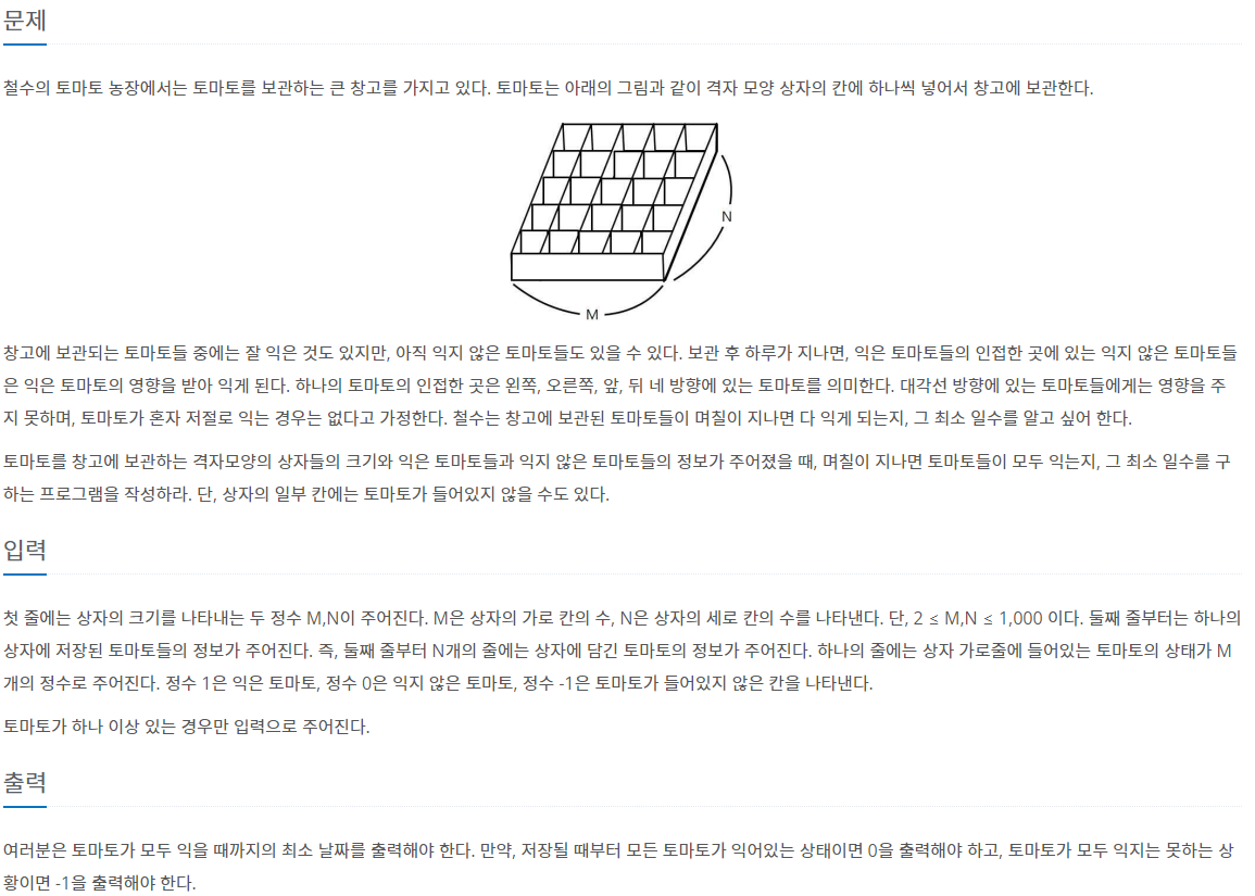 소스코드 import sys from collections import deque m,n,h = map(int,input().split()) graph = [] queue = deque([]) for i in range(h): tmp = [] for j in range(n): tmp.append(list(map(int,sys.stdin.readline().split()))) for k in range(m): if tmp[j][k]==1: q
