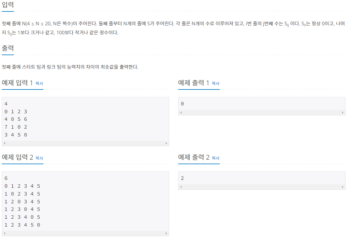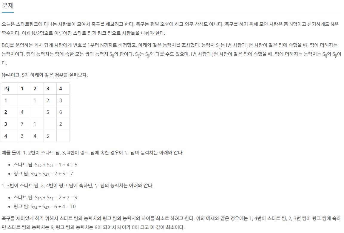2. 팀원들의 조합을 가지고 각각 start 팀과 link 팀의 총 합계를 구합니다.