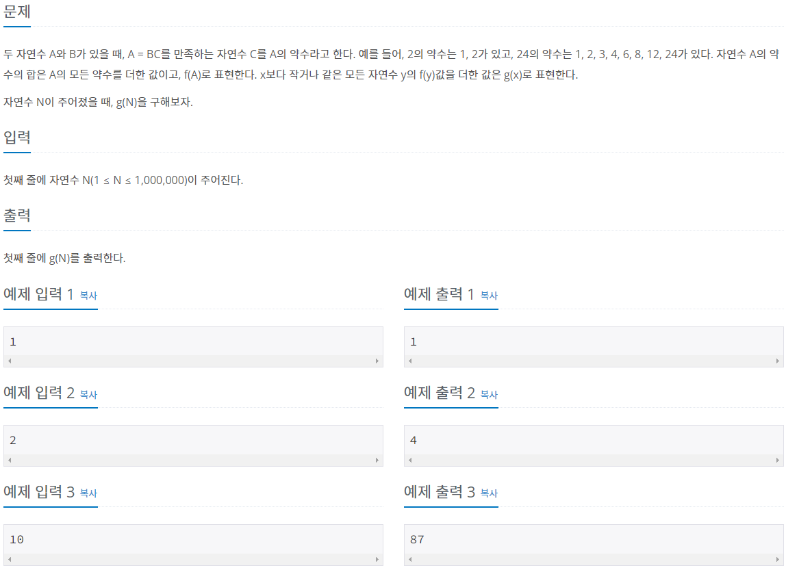 문제 그대로 약수의 합을 구하는 함수를 만들고 for문을 돌면서 합을 구하는 알고리즘을 짰는데 시간 초과가 났다.