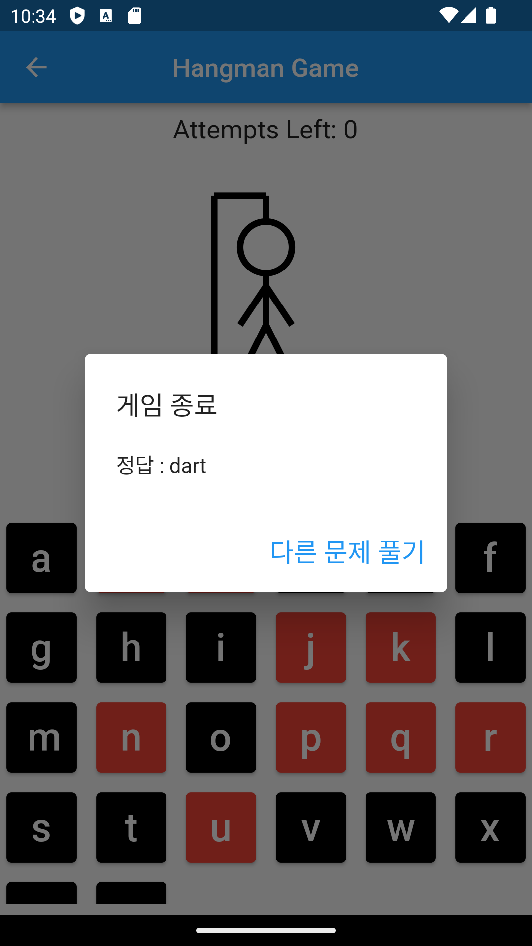8번의 기회를 다 소진하거나 정답을 맞추면 게임이 종료되고 처음화면으로 넘어가게 됩니다