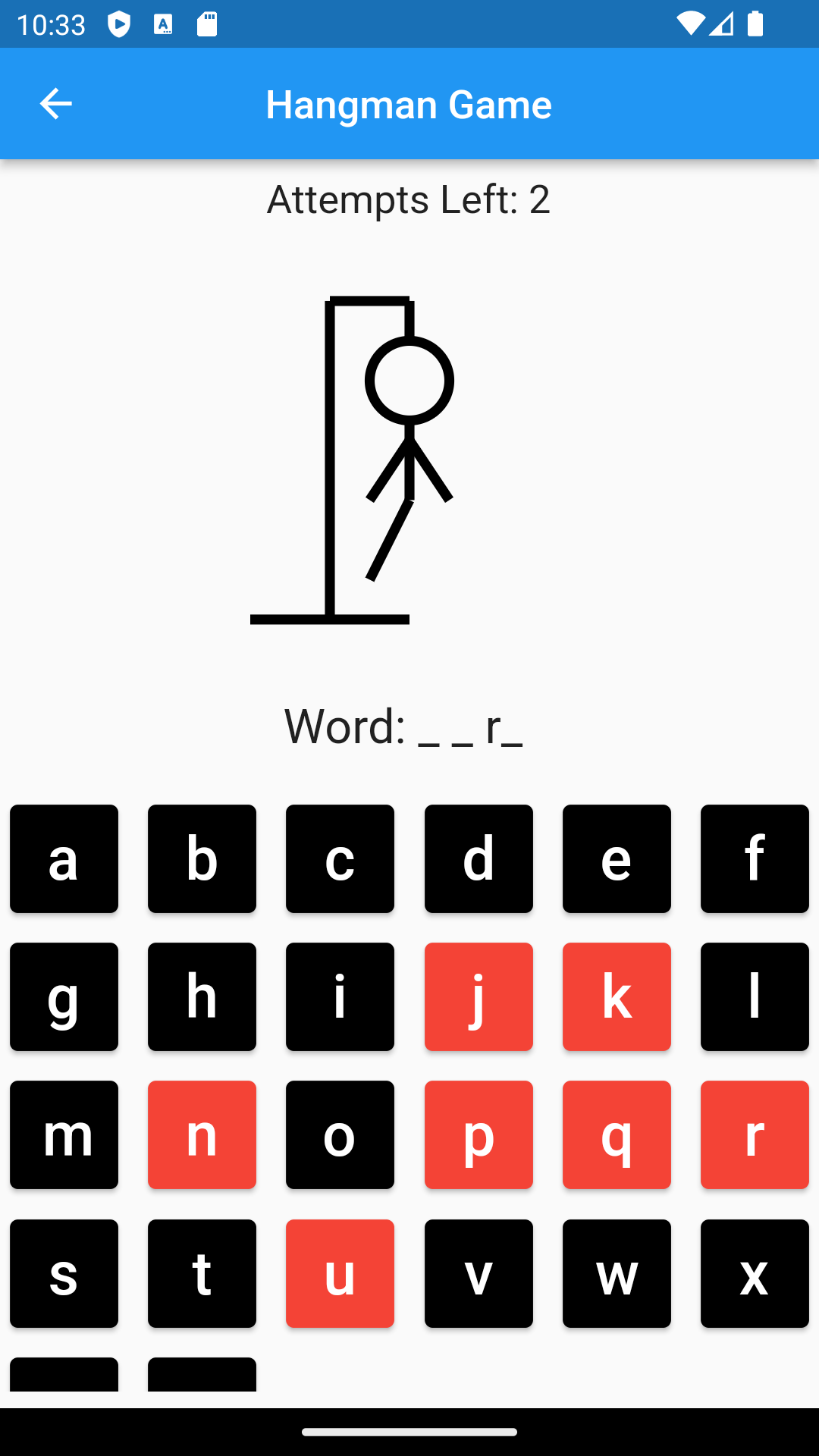 단어를 틀리면 버튼 색이 변하고 우리의 행맨이 그려지기 시작합니다..