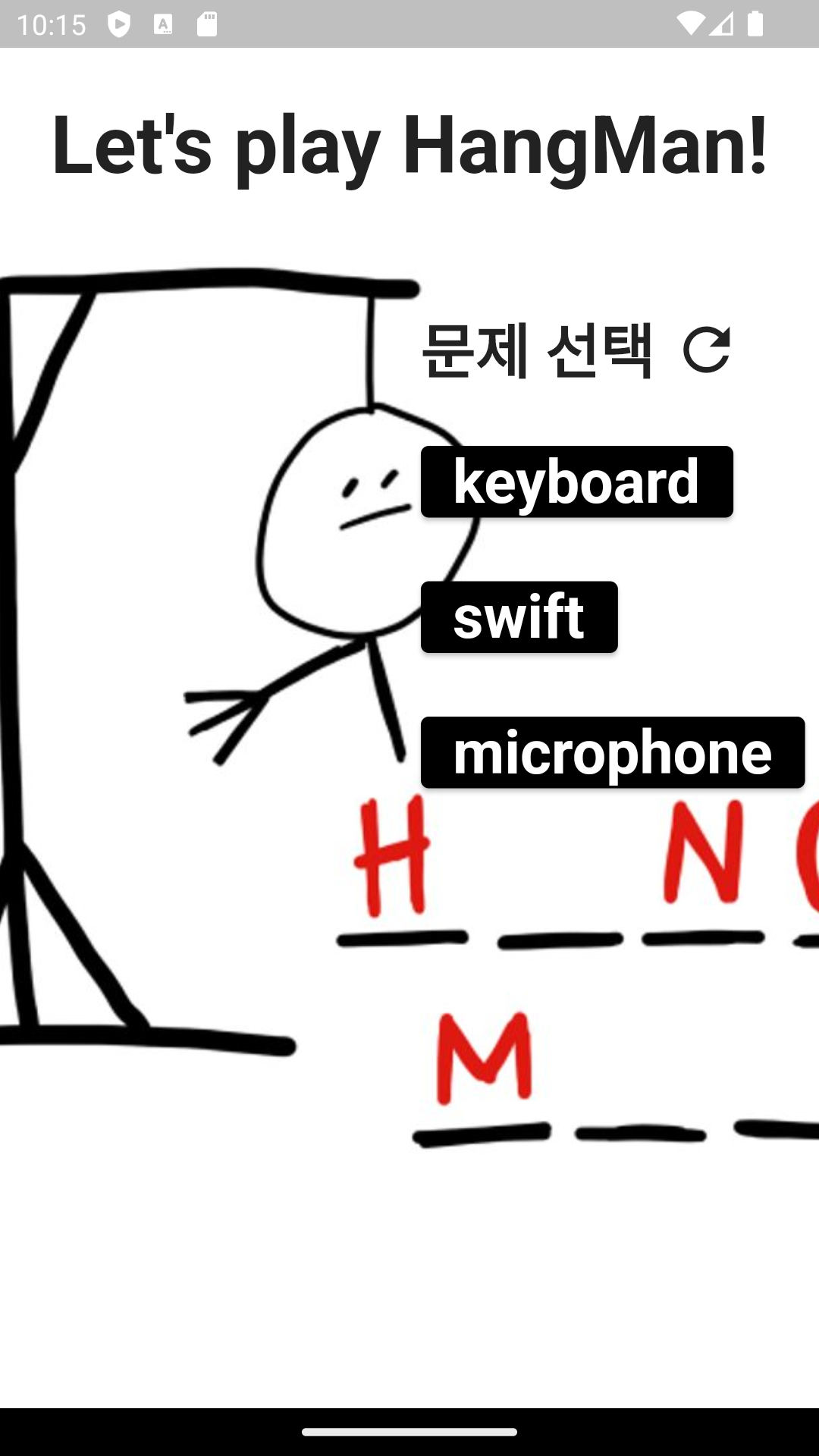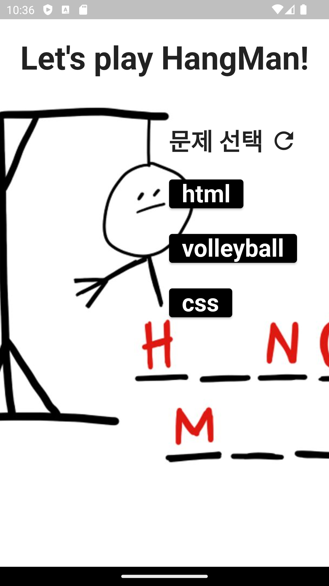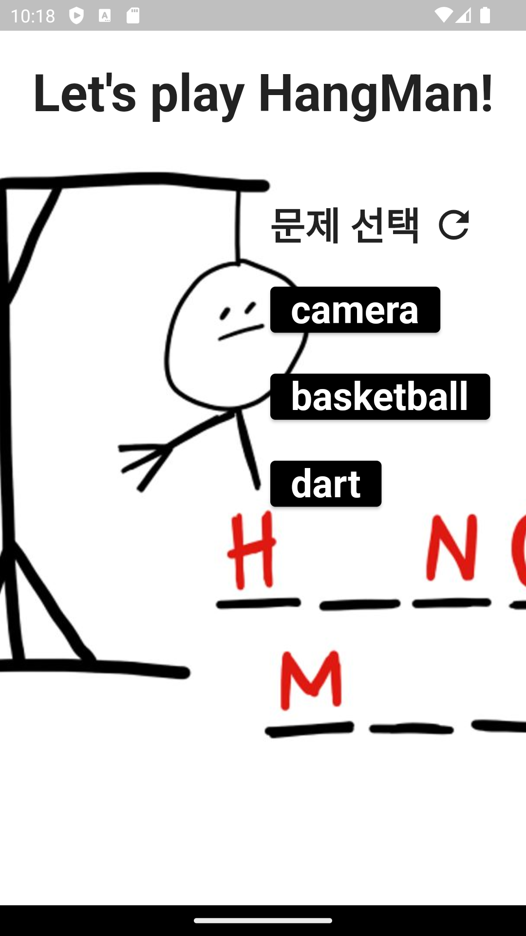 위의 페이지에서는 'hangman', 'flutter', 'dart', 'mobile', 'game', 'program', 'developer', 'android', 'java', 'kotlin', 'swift', 'javascript', 'html', 'css', 'python', 'computer', 'keyboard' 'mouse', 'screen', 'monitor', 'headphone', 'microphone', 'camera', 'speaker', 'guitar', 'piano', 'basketball', 'football', 'tennis', 'volleyball', 'hockey', 'soccer', 'baseball', 등의 예시 단어에서 random으로 3개 단어가 나오고 새로고침 버튼을 누르면 다시 random으로 3개 단어가 나오게 되어 있습니다.