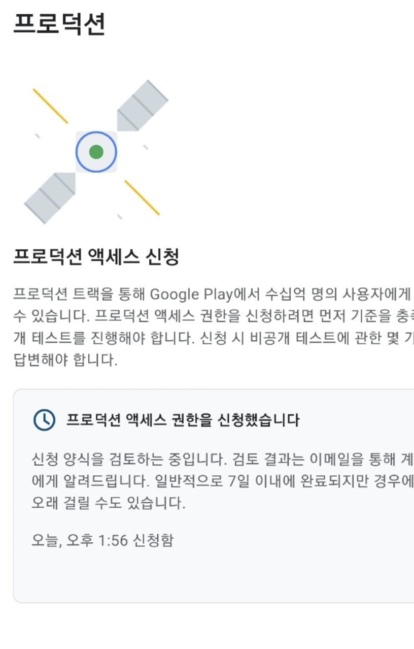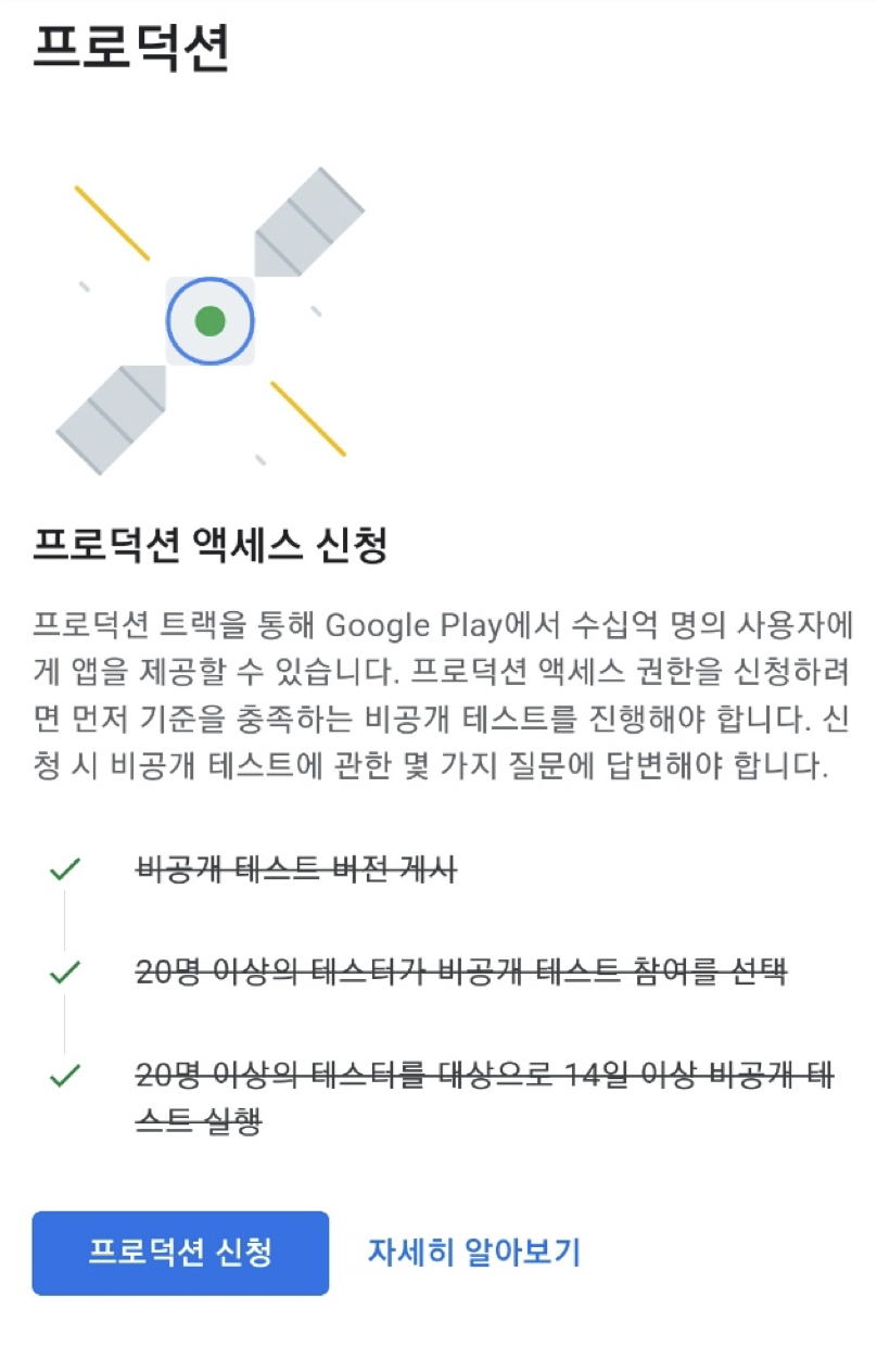 테스터 20명을 모집하고 2주간 설치를 진행하면 이렇게 프로덕션을 신청할 수 있는데요
